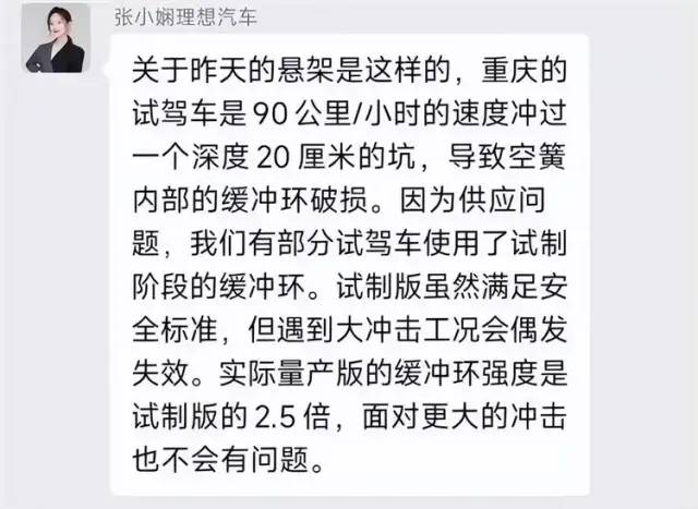 对此,前汽车评测类自媒体人、现入职理想的张小娴表示,出现故障的试驾车使用了试制阶段的缓冲环;同时,也要考虑到试驾车是在以90公里每小时的速度,冲过深达20厘米的深坑的客观环境。