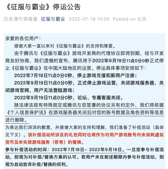 7月18日,腾讯旗下战争策略手游《征服与霸业》官微发布停运公告,由于腾讯与《征服与霸业》游戏开发商的代理协议即将到期,经与开发商友好协商,腾讯将于2022年9月19日11点0分0秒正式停止《征服与霸业》在中国大陆地区的运营。