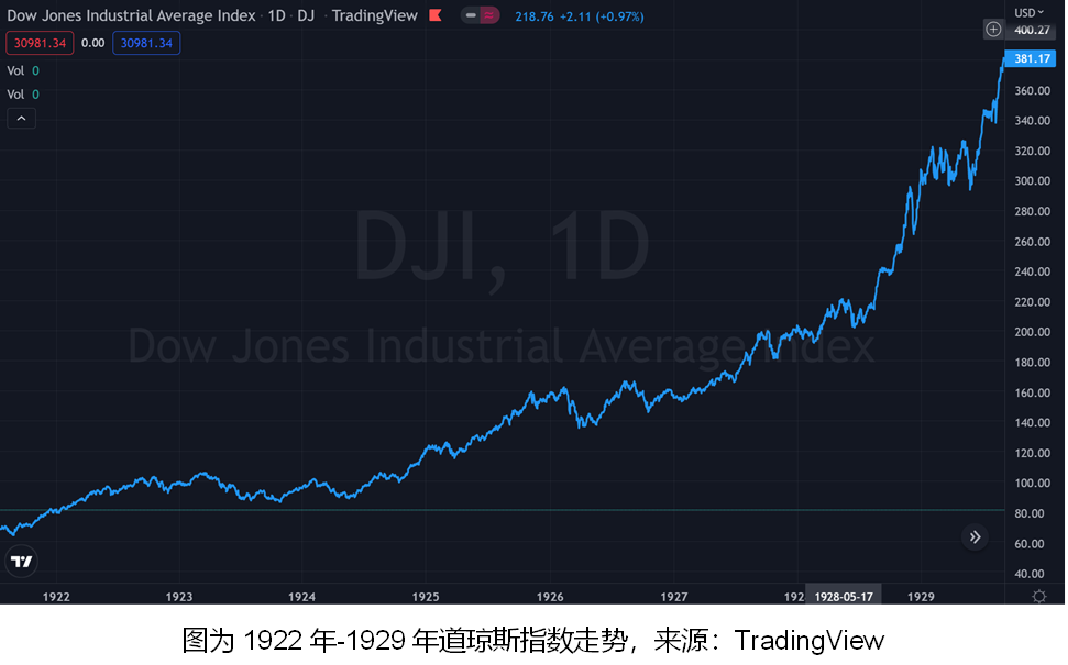 在1929年9月以前,华尔街股市经历了持续7年左右的繁荣,所有股票价格都节节上升。道琼斯指数从1921年的63.9点升至1929年9月的381.17点。
