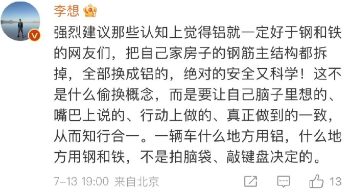 不过,对于这一质疑,李想直接在社交平台“开喷”,他表示:“觉得铝就一定好于钢和铁,把自己家房子的钢筋主结构都拆掉,全部换成铝的。一辆车什么地方用铝,什么地方用钢和铁,不是拍脑袋、敲键盘决定的。”