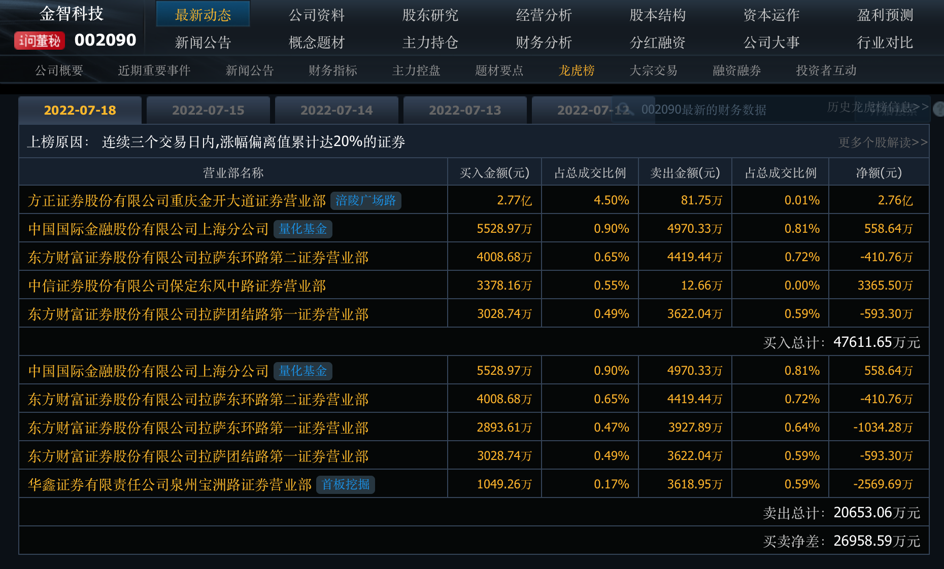 金智科技这种涨法,还是与游资的蜂拥而入有关。7月18日公司因连续3个交易日涨幅偏离值累计达到20%而上龙虎榜,数据显示,买入最多的方正证券重庆金开大道营业部直接买入2.77亿元,位列买一,中金公司上海分公司以5528.97万元位列买二,紧随其后的东方财富证券拉萨东环路第二营业部,买入金额为4008.68万元,中信证券保定东风中路营业部买入3378.16万元,东方财富证券拉萨团结路第一营业部买入3028.74万元。