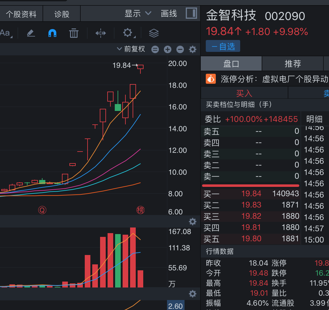 金智科技(002090.SZ)11个交易日完成9个涨停板。7月4日这只股票的开盘价还是8.89元,到7月18日收盘金智科技股价已经冲到了19.84元,市值膨胀了44亿。