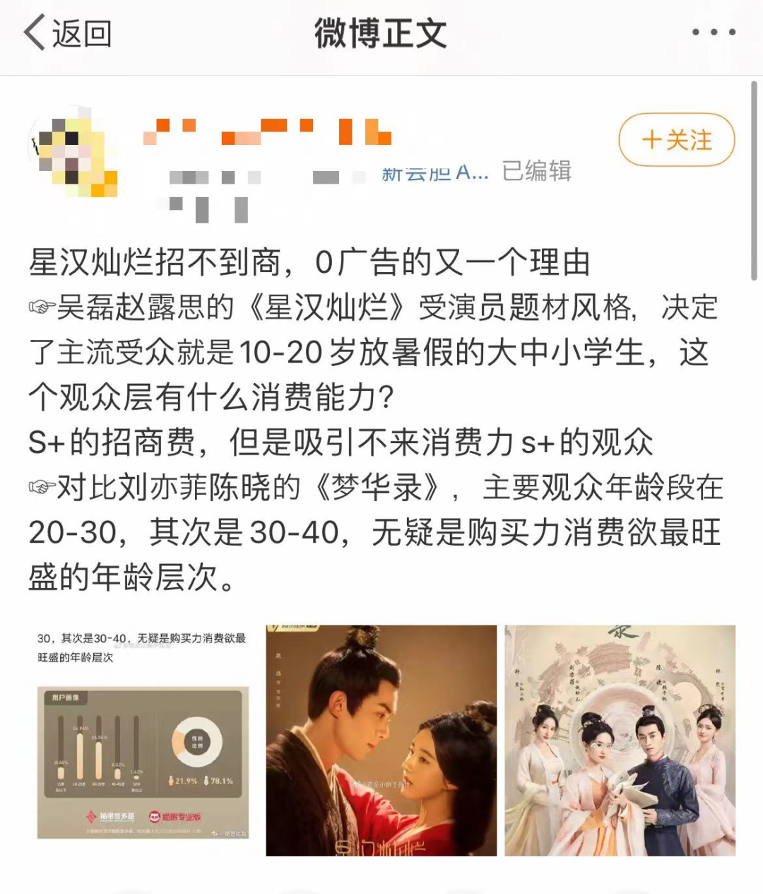 《星汉灿烂》为何会成为品牌主的“特例”呢?有微博大V指出,这主要是受到用户群的影响:该剧的演员、题材所聚焦的受众主要是10-20岁的大中小学生;而《梦华录》受众则主要集中在 20-40岁,购买力消费欲最旺盛的年龄层次。