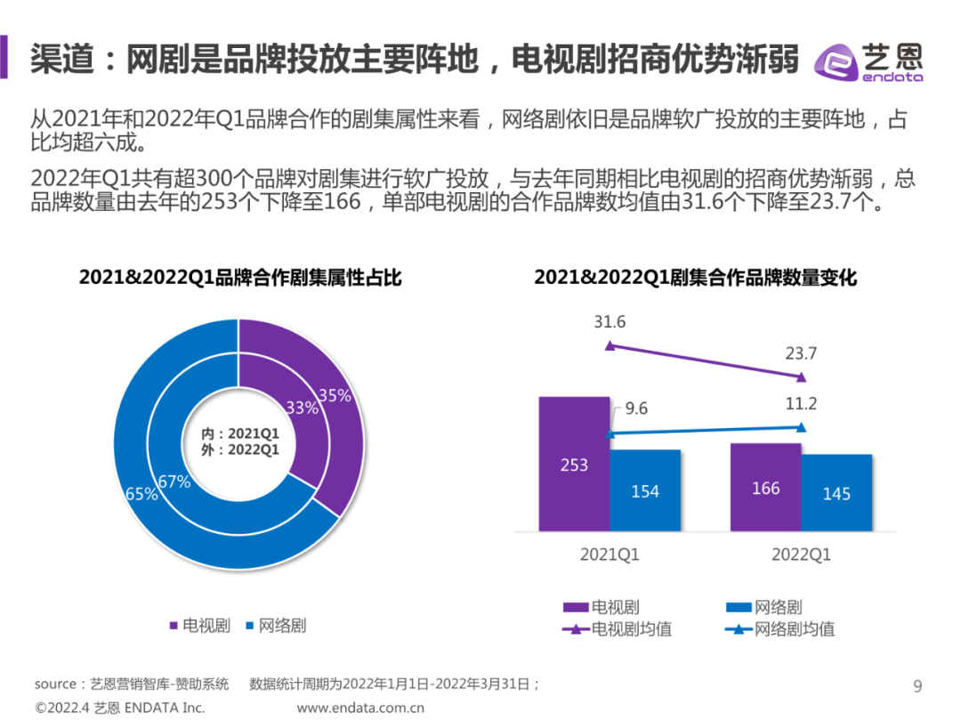 今年以来招商市场的确遇冷,不仅是综艺市场,剧集市场同样显著。艺恩数据显示,2022年Q1共有超300个品牌对剧集进行软广投放,较之去年同期出现大幅度下滑,其中电视剧合作品牌总数自253个下滑至166个,不过单部网络剧合作品牌数均值仍然呈上升趋势。