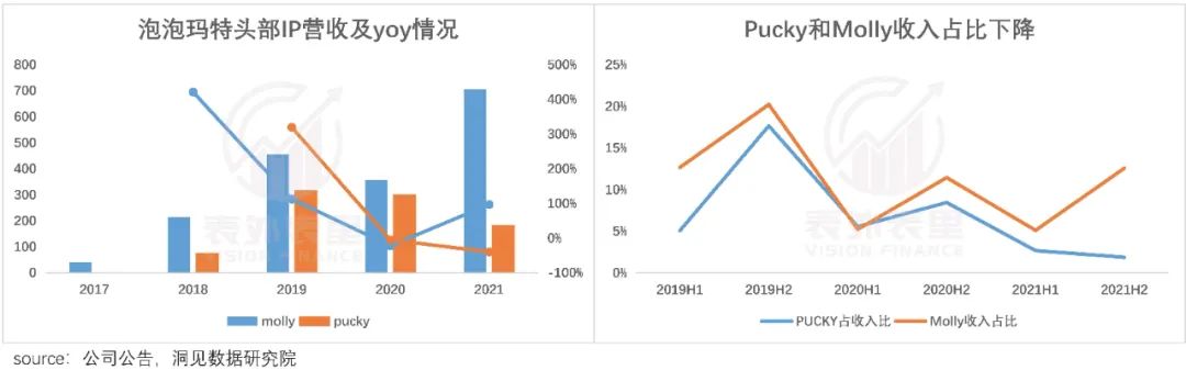 可以看到,头部老IP Molly和Pocky营收增速明显下滑,占总体营收比也逐渐降低。