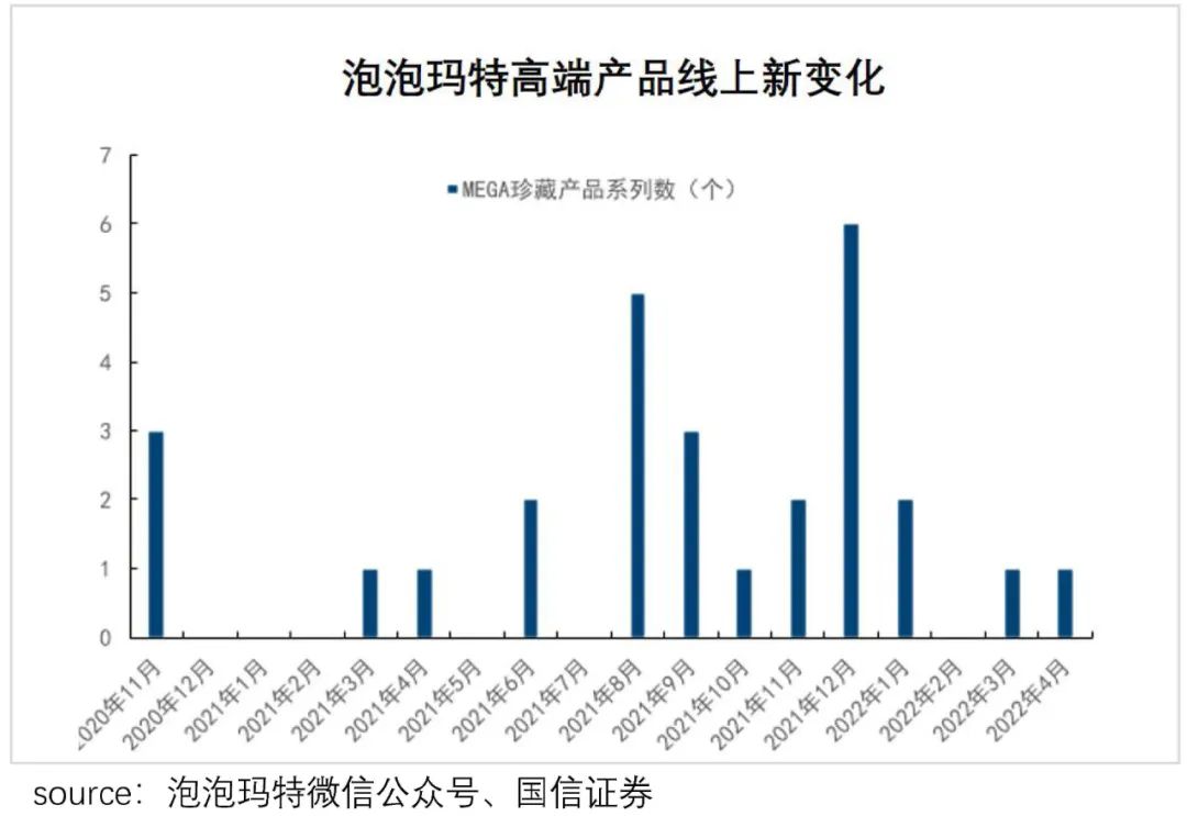 可以看到,2021下半年以来,泡泡玛特大幅提高了其高端产品——MEGA的上新频率。