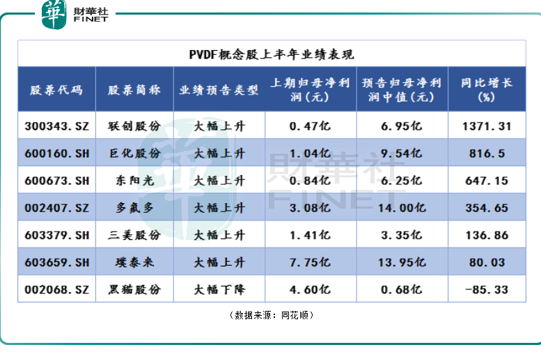 身为行业龙头,联创股份稳稳地吃上了这波“涨价”红利。从已披露中期业绩预告的企业中,不难发现,几乎所有与“PVDF”挂钩的企业都赚得盆满钵满,且盈利能力还在逐步释放。