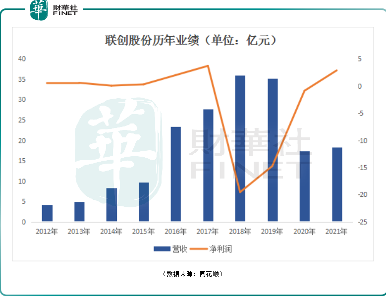 回顾往年表现,联创股份业绩起伏较大。2015年,联创股份进入互联网营销行业,2018年-2020年公司业绩连续3年亏损,合计达35.15亿元。