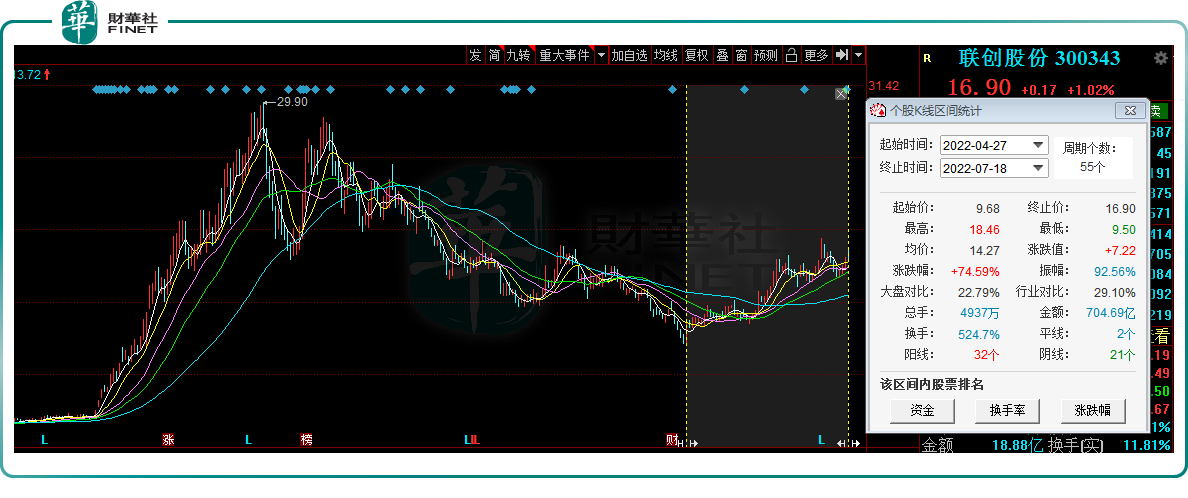 股价表现上,2021年,联创股份曾掀起一轮大涨,股价从2021年7月初的4元/股飙涨至9月份的29.9元/股高点,涨幅超6倍,而后随着新能源板块持续震荡下行。截至7月18日收盘,该股报收16.9元/股,自2022年4月27日反弹迄今,累计涨幅74.59%。