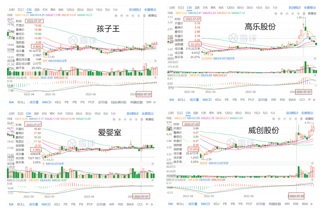 或许是由于相关政策利好,截至当日收盘,孩子王、爱婴室分别上涨6.86%、4.39%。早幼教概念股高乐股份封涨停。