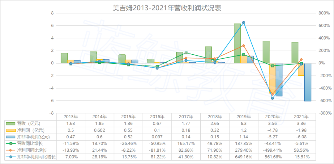 值得注意的是,自2013年至2019年,美吉姆共盈利约3.45亿元。而2020-2021两年间,美吉姆便亏损了约6.76亿元,超出前7年盈利总和近一倍。