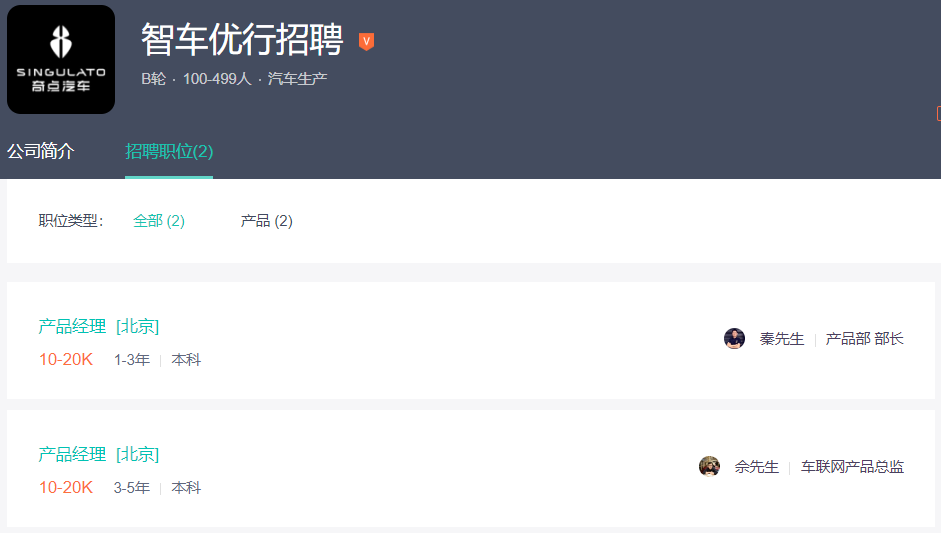 近日,去国内几个主流的招聘网站翻了一下智车优行的招聘岗位,发现智车优行在智联招聘没有正在招聘的职位,猎聘有5个在招职位,BOSS直聘上是两个:其中一个是产品经理,另一个也是产品经理。