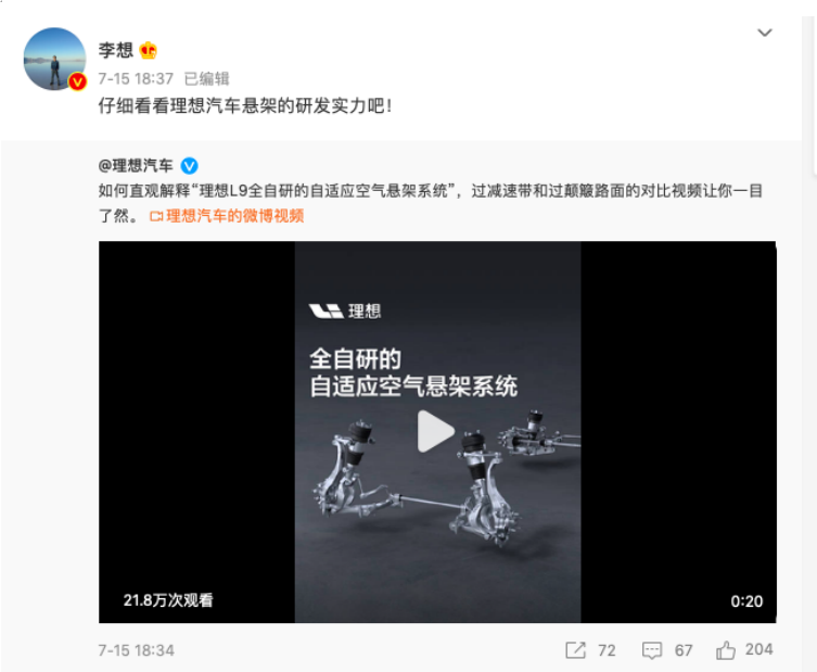 7月15日晚,李想连续转发两条有关L9空气悬架的微博,以回应对L9空气悬架的质疑。