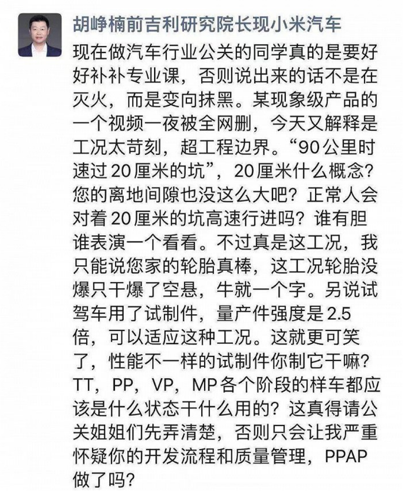 回应中的第一句话,是强调了90公里时速在“20厘米深大坑”面前的客观困难。但是这一点很快遭到了原吉利研究院院长、现顺为资本投资合伙人胡峥楠质疑。