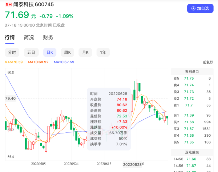 受进入理想L9供应链因素推动,6月28日闻泰科技也收获涨停。