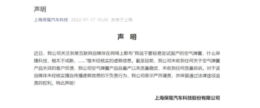 理想L9空气弹簧三家供应商之一的保隆科技(603197.SH)也对相关的舆情作出了回应。