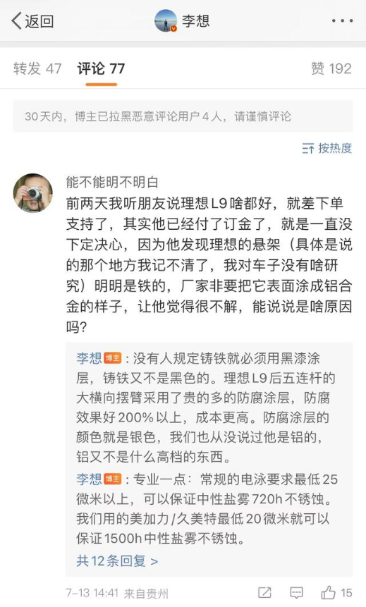 这其实不是理想L9的空气悬架第一次带来关注。7月13日,有位网友以非常友好的语气提出“理想L9为何要将铁质悬架涂成铝合金配色”的疑问,理想汽车CEO李想亲自下场,以略带激烈的言辞回复了此网友。