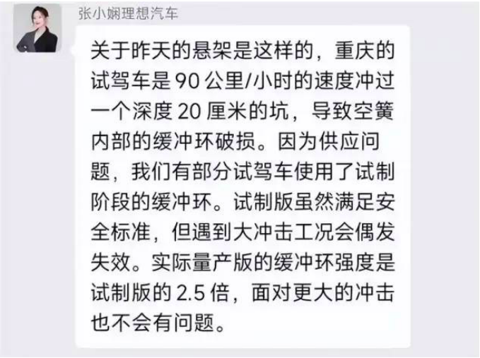 网传理想汽车NPS运营负责人张小娴对空气悬架断裂的回应,如下图所示。