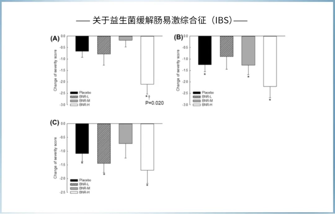 在一项《关于益生菌缓解肠易激综合征(IBS)》的研究中,55名年龄超过20岁的志愿者被随机分为安慰剂组、低剂量组、中等剂量组和大剂量组。