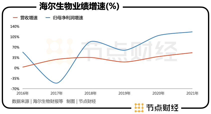 体现在财报上,仅就有公开数据的2015年以来,海尔生物奔跑最快的时段为2020年和2021年,营收增速分别为38.47%、51.62%,归母净利润增速分别为109.24%、121.82%,而在2015年-2019年,其营收复合年均增长率为21.3%,归母净利润复合年均增长率22.8%。