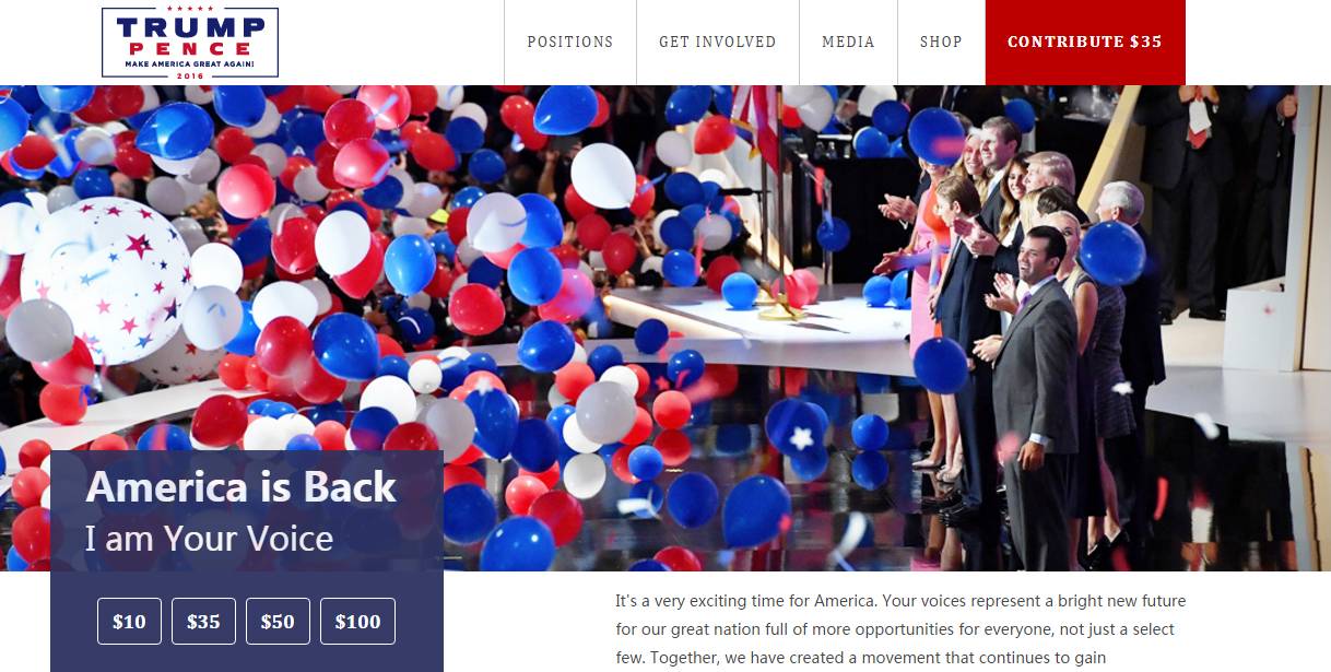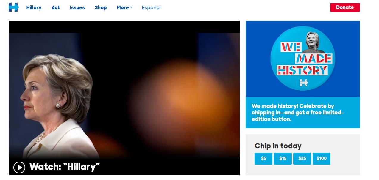 希拉里竞选主页不但包括一个媒体端、一个捐赠系统,还有一个成熟的电商平台。竞选主页主图与版式以天为单位进行迭代。