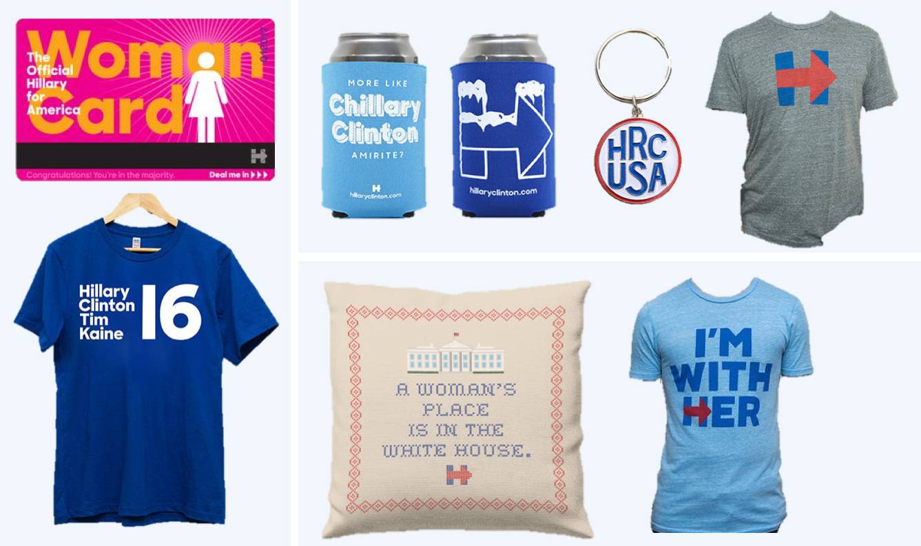 以电商平台为例,出售的物品包括从酒杯到扑克牌,仅T恤就有 30 种花色,模特兼顾各色族裔,兼顾不同族裔,所有的商品都是美国制造,并且打上 “Made in America” 的标识,突出了希拉里重整美国制造业的决心。商品中强调有机原料,呼应了希拉里大力发展新能源、推广清洁技术的环境政策。