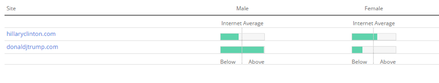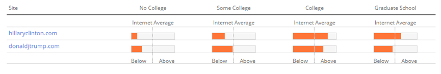值得一提的是,访问特朗普竞选主页的男性比例远多于访问希拉里竞选主页的,女性比例则反之。同时,访问特朗普竞选主页的用户普遍教育程度低于希拉里竞选主页。