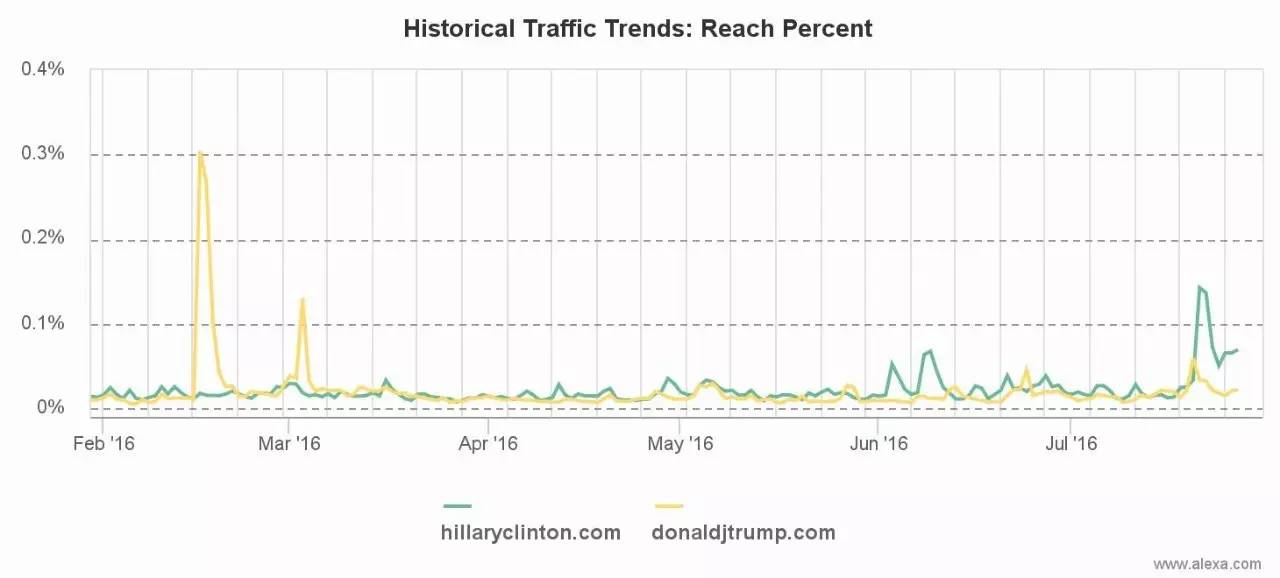 深蓝Deeperblue 编辑部对比分析了两党的两位候选人的竞争网站,希拉里的竞选主页流量从 2016 年 2 月以来一直在稳步上升,而特朗普的网页在初期占有流量优势的情况下在突然在 5 月中旬下降,最终被希拉里超过。而 5 月一向是两党党内竞选的关键月份。