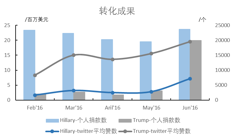 特朗普和希拉里的竞选页面都承担了一个相同的功能:所有民间捐款(小于 2700 美元)的唯一入口。我们把从二月份开始的民间捐款数统计出来,放到上一张社交媒体热度图上,会发现特朗普的 “尴尬”:更高的媒体社交热度并没有带来竞选页面捐款入口更多的捐赠数额。希拉里的竞选主页的 “吸金术” 证实比特朗普更优。