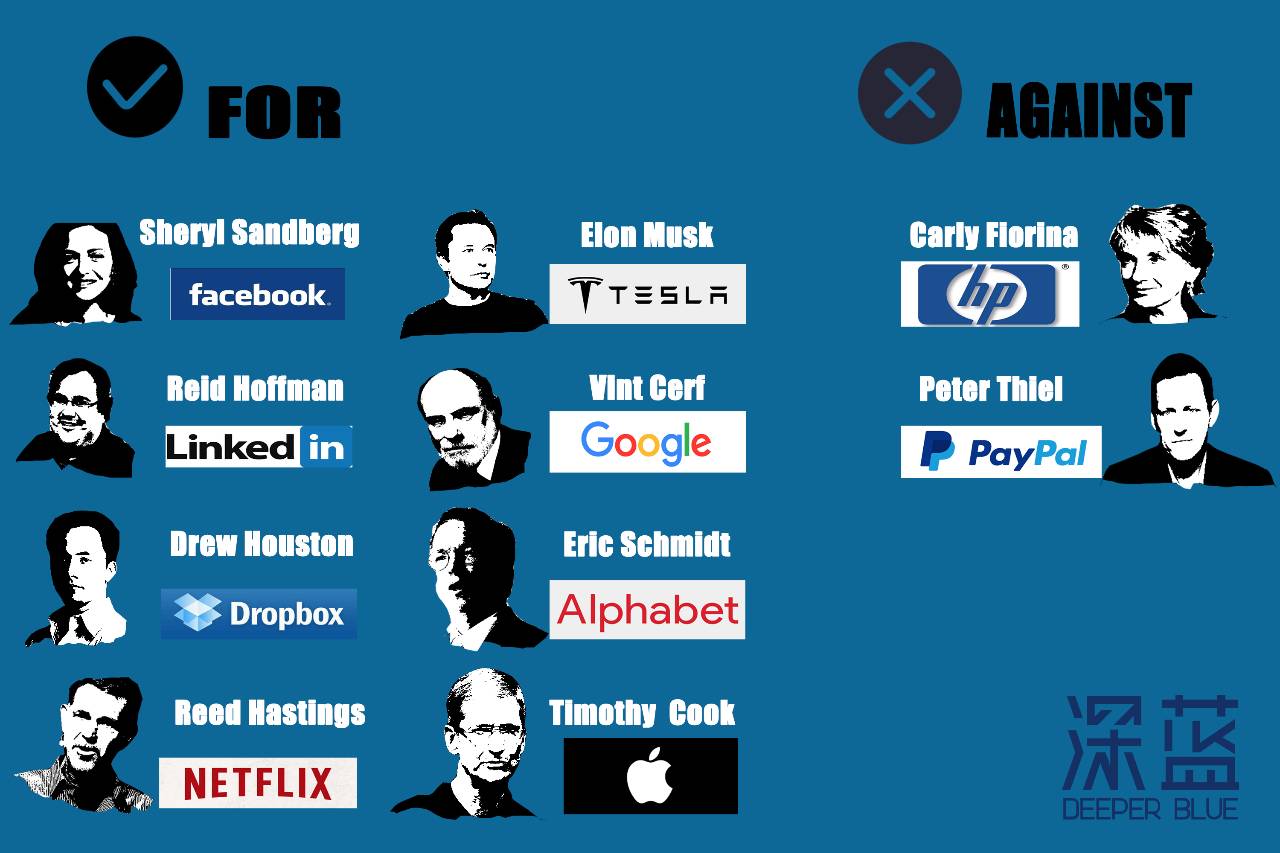 CEO 蒂姆·库克(Tim Cook)、LinkedIn 创始人雷德·霍夫曼(Reid Hoffman)、Dropbox 创始人德鲁·休斯敦(Drew Houston)、Netflix CEO 里德·哈斯廷斯(Reed Hastings)、Facebook COO 谢丽·桑德伯格(Sheryl Sandberg)、特斯拉CEO 伊隆·马斯克(Elon Musk)、Google 副总裁文顿·瑟夫(Vint Cerf)。