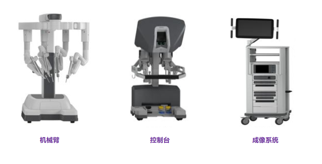 达芬奇模式下的腔镜类手术机器人由三个部分组成: