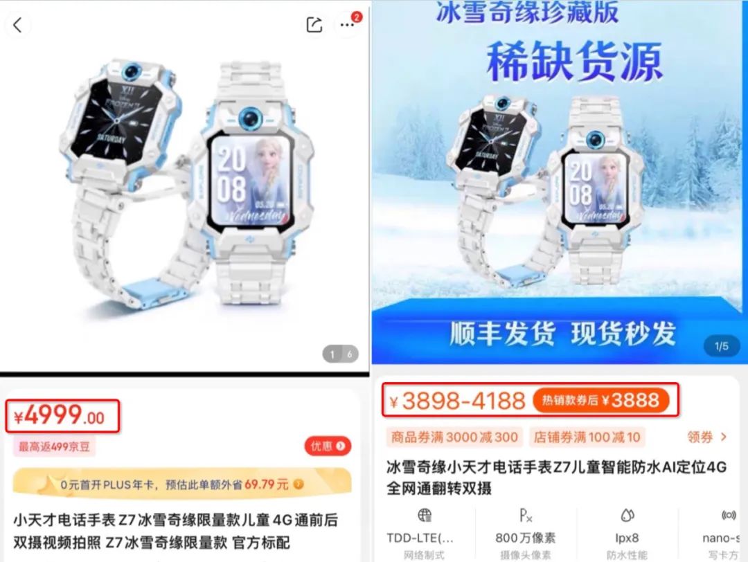 捆绑热门迪士尼IP加上限量发售,Z7冰雪奇缘艾莎公主款在门店和官方旗舰店均卖到断货,原价1998元,现在经销商手中的市场溢价已达到3888元,在京东上一些店铺里甚至挂出了近5000元的售价。有家长调侃:“没想到过了半年,闺女的手表价格还能翻倍,早知多囤几块,比炒股强。”