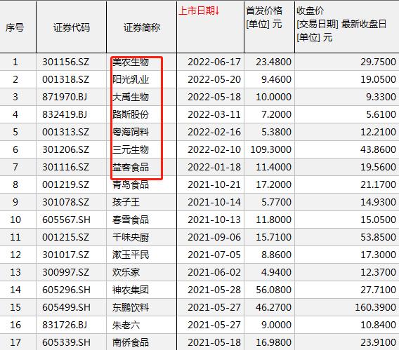 上半年A股食品行业成功IPO的公司有7家,分别是美农生物、阳光乳业、大禹生物、路斯股份、粤海饲料、三元生物和益客食品。