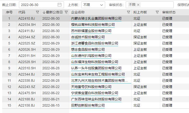 此外,已受理的食品行业IPO公司,前半年一共有15家,而这15家全部是在6月受理。从上市板块看,拟在北证、上证主板和深证主板上市的分别是6家、6家、3家,分别占比为40%、40%、20%。