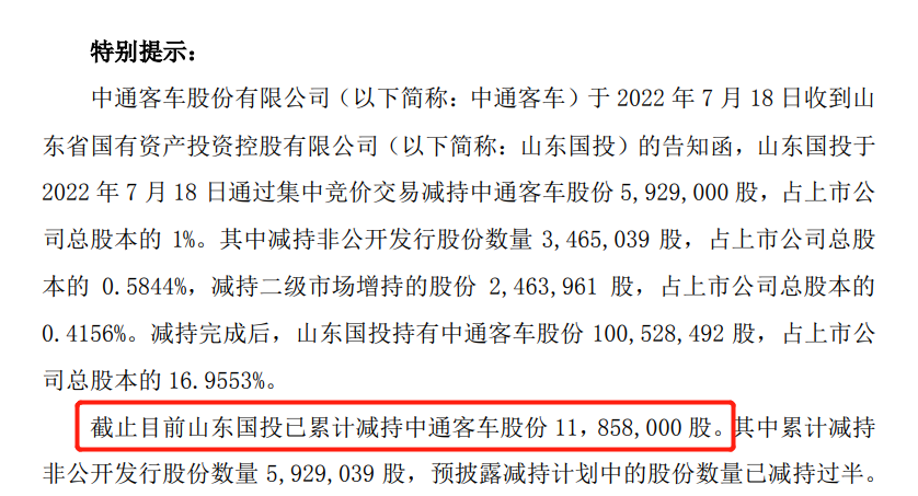 7月18日晚,中通客车公告,山东国投于2022年7月18日通过集中竞价交易减持中通客车股份592.9万股,占上市公司总股本的1%。
