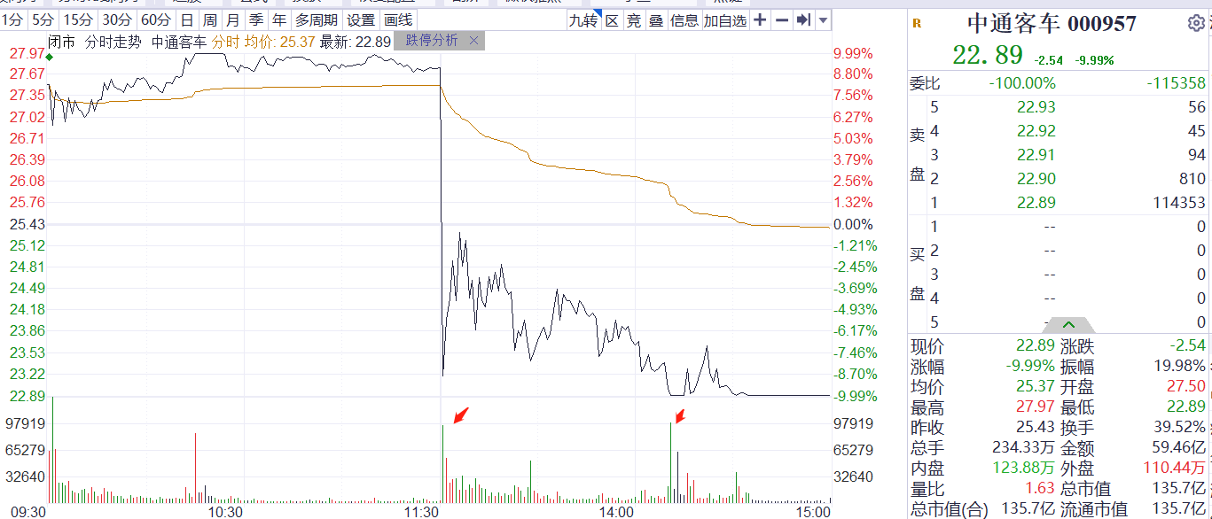 7月19日早盘,中通客车高开高走,一度涨停封板;午后两笔大卖单先后让中通客车大跌并封死跌停板。截至收盘,仍有超11.5万手卖单未能出逃。
