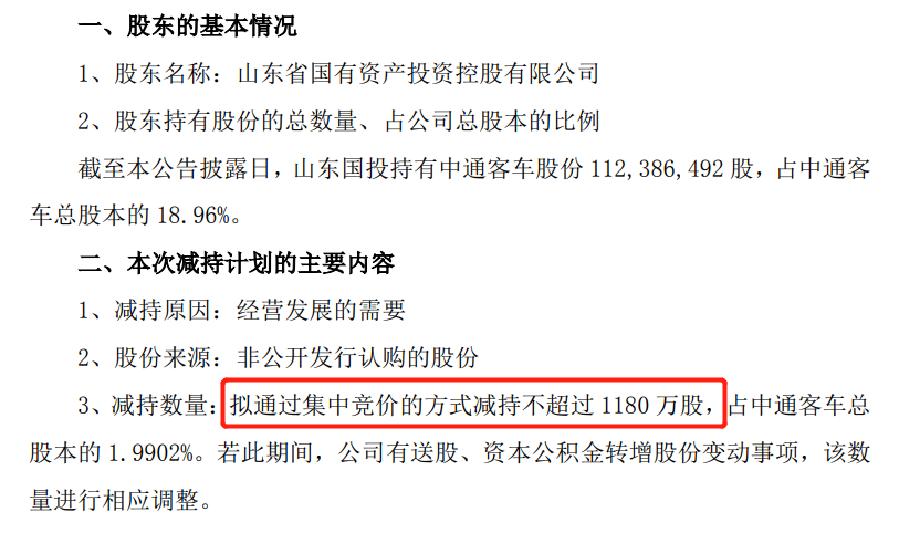 今年6月1日中通客车公告称,公司持股18.96%的第二大股东山东省国有资产投资控股有限公司(下称山东国投)拟最高减持1180万股,占总股本的1.99%。