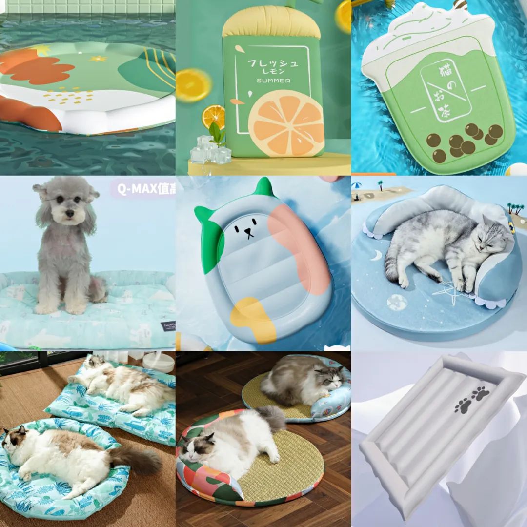 小小的冰垫和凉席,尽管在技术和效果上似乎难有创新,但仍有不少品牌尝试打出特色,为毛孩子们带来独特的使用体验。在外观上,有的设计成饮料形状,并配上有趣的图案和充满活力的色彩,试图通过颜值来吸引铲屎官和毛孩子的喜欢。在材质和工艺上,商家们更是使出浑身解数,如采用PVC织物达到耐磨耐抓的效果、有的采用高弹PP面接触起来柔软亲肤、也有在外圈设计加棉支撑头颈,让毛孩子躺着更舒适。这也从侧面说明,宠物用品已经从“人无我有”到“人有我优”的良性竞争阶段了。