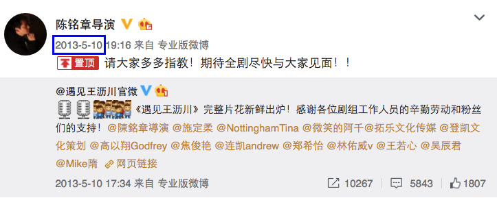 正如不少书粉所爆料的那样,《遇见王沥川》在2013年就拍摄完成了,此后积压了三年之久,而该剧的台湾导演陈铭章,在微博上也是将此剧的片花整整置顶了三年之久。