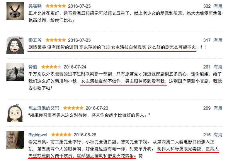 剧中的两位主演高以翔和焦俊艳的表演也得到了原著粉的认可,在豆瓣的短评中,不少是夸赞“女主演技自然不做作,男主眼神苏到没有我”的类似留言。