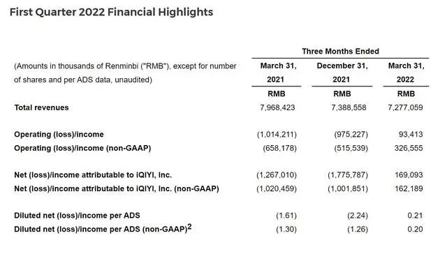 据今年一季财报显示:爱奇艺第一季度总营收为73亿元,同比下滑9%,归属于爱奇艺的净利润为1.691亿元,而上年同期净亏损13亿元。