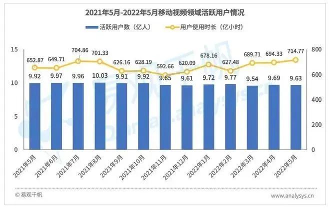 5月,移动视频活跃用户数达到9.63亿人,用户使用时长实现三个月持续增长,达到714.77亿小时,成为近一年内最高值,同比增长10%。