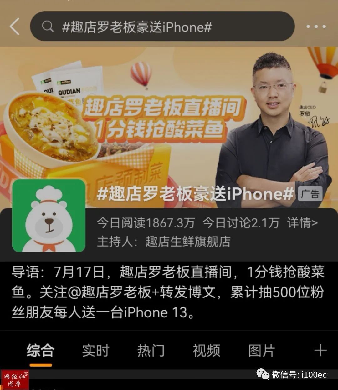 趣店罗老板在7月17日的直播中,单场累计销售突破2亿,可谓是火爆出圈。其中,销量的主力军是59.9元的水煮鱼,单款商品的销量就超过了100万,销售额达到7507.3万。除此之外,酸菜鱼、水煮肉片、啤酒鸭等共9款菜品的销售额都超过了千万。从带货商品可以看出,这场直播是一场预制菜的狂欢盛宴。