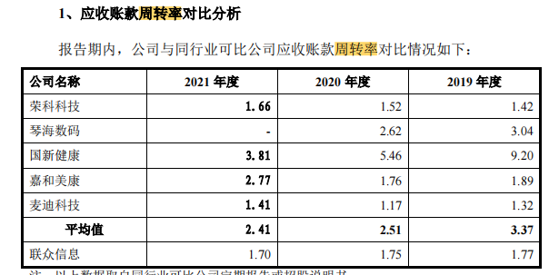 并且,同期内国新健康 、嘉和美康、琴海数码等行业应收账款周转率均值为3.37、2.51、2.41,而联众网络的应收账款周转率则为1.77、1.75、1.7,低于行业均值。
