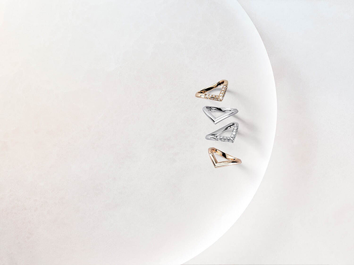镶嵌钻石的戒指,是从1920年代到30年代,加斯东-路易威登在行李箱上装饰的艺术风格“V”图案。在精致的形态上,钻石的细腻闪光增添了华丽。钻石镶嵌图形的戒指,灵感来自于1888年乔治·威顿发明的达米耶帆布,配上钻石的光芒,营造出豪华之感。