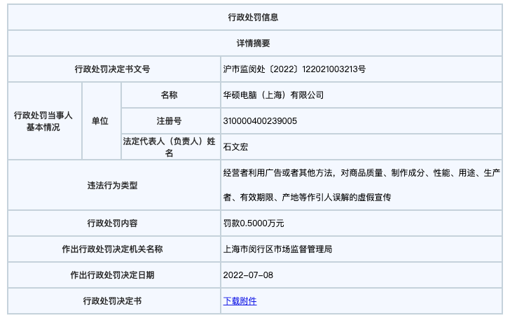 上海市市场监管局网站显示,7月8日,华硕电脑(上海)有限公司因利用广告或者其他方法,对商品质量、制作成分、性能、用途、生产者、有效期限、产地等作引人误解的虚假宣传,被上海市闵行区市场监督管理局处以罚款0.5万元。