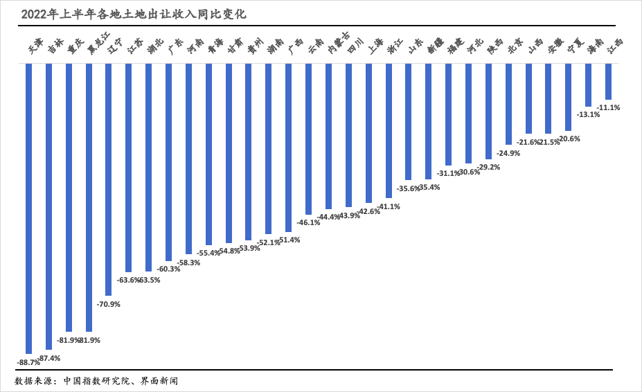 界面新闻根据中国指数研究院提供的数据计算,除没有公布数据的西藏外 ,全国其他30个省(自治区、直辖市)上半年卖地收入均为负增长,同比跌幅超过50%的省份有14个。其中,天津、吉林、重庆和黑龙江等4省土地出让收入缩水最严重,同比下降超过80%,海南、江西降幅最小,同比降幅在10%左右。