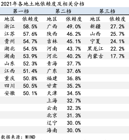 (1)第一档:土地财政依赖度超过50%,这些地区土地依赖度较高,土地出让收入缩水对其财力影响较大;