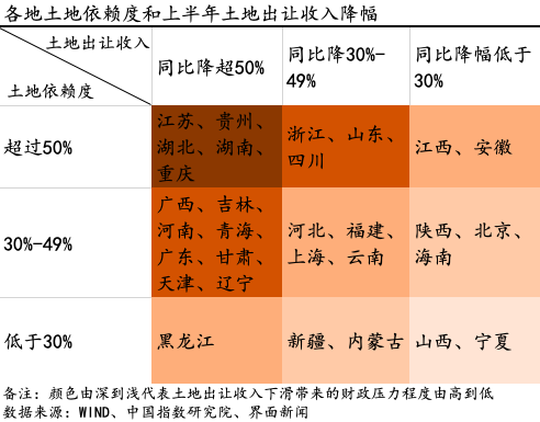 土地依赖度在30%-50%之间的15个省份中,天津、吉林、辽宁和广东等4省上半年卖地收入同比降幅超过60%,降幅分别达到88.7%、87.4%、70.9%和60.3%,这些省份财力也面临较大的压力。