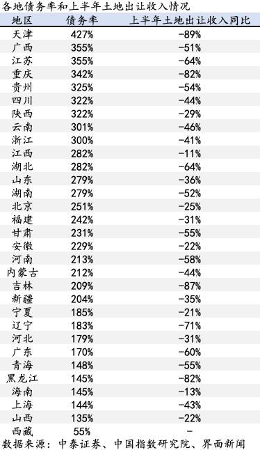 其中,天津债务率最高,超过420%,同时天津也是上半年土地出让收入减收幅度最大的地区。此外,重庆、江苏、湖北、贵州、湖南、广西等6省也同时具有债务率偏高且土地出让收入降幅较大的特征,其偿债压力值得关注。